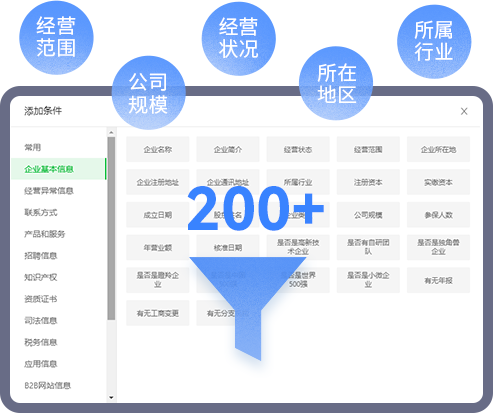 根據企業所在行業目標客戶畫像,設定客戶篩選條件,更有海量企業搜客範本,按需調用; 智慧推薦客戶,200+篩選條件精准匹配高品質線索。